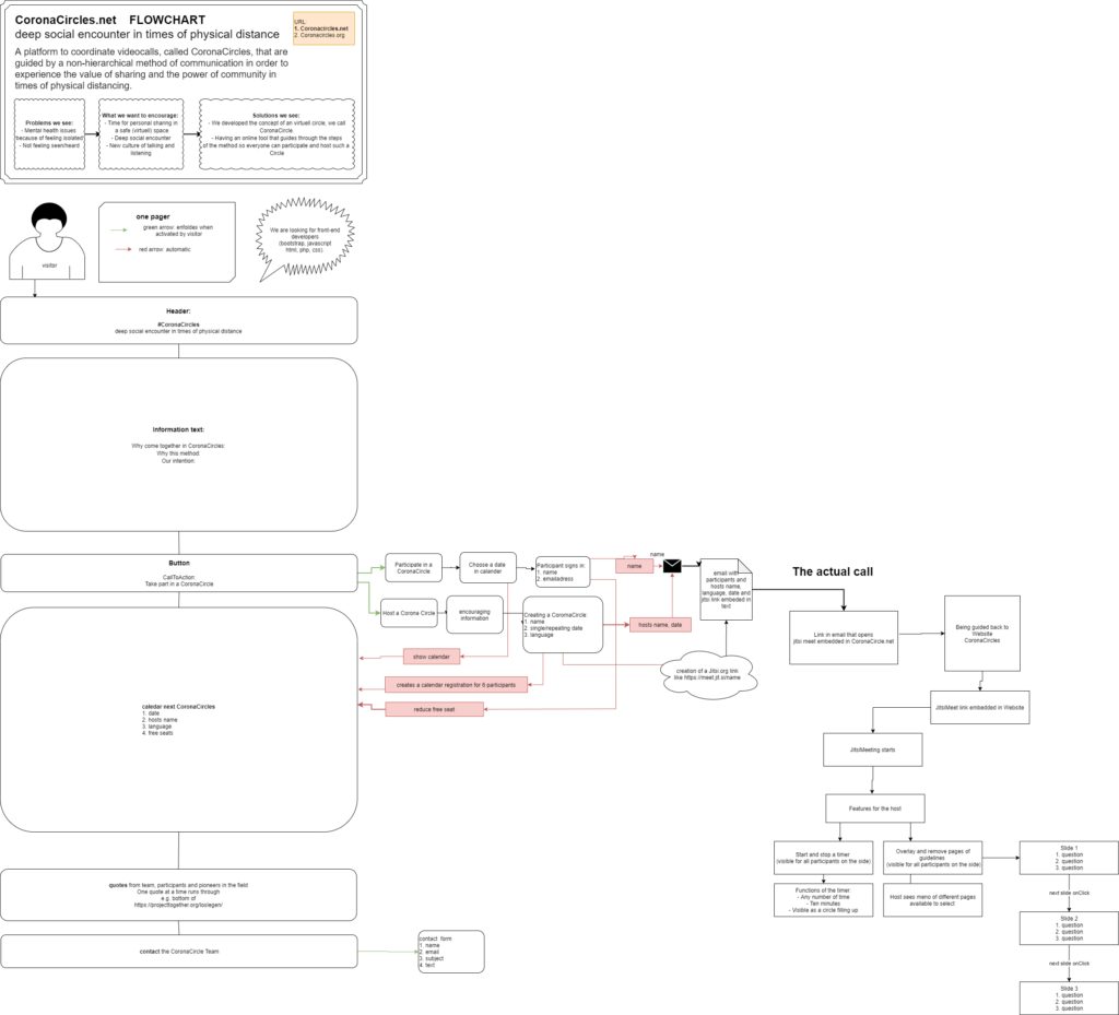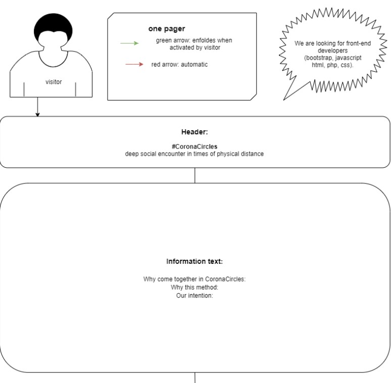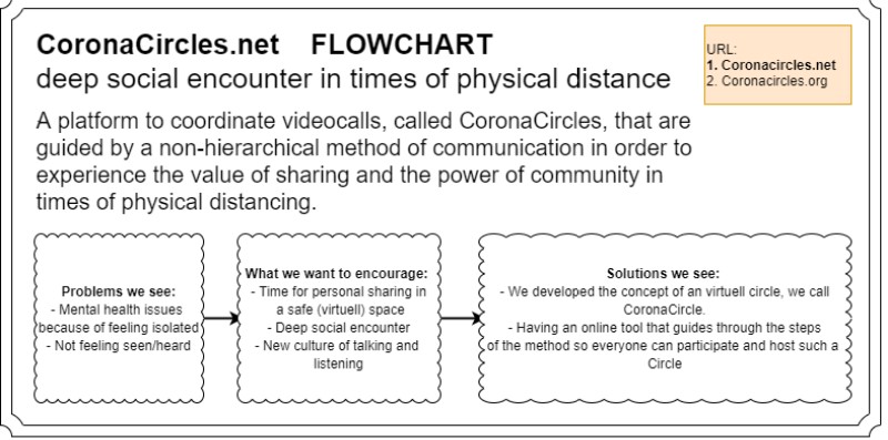 In der Zeit der sozialer Distanzierung, Unsicherheit und in der viele Menschen Angst haben, hatten wir den Impuls, ein Online-Tool zu schaffen, mit dem Menschen in Online-Videoanrufen tiefgreifende Begegnungen mit anderen Menschen haben und erleben können. Wir arbeiten an der Schaffung einer Plattform für das Hosting und die Teilnahme an Videoanrufen für Gruppen mit hilfe der CoronaCircles-Methode. Diese Methode ist ein dreistufiges Programm, um einen Raum zum Zuhören, Teilen und zum Erleben der Gemeinschaft zu schaffen. Wir verbinden die alte und kraftvolle Erfahrung, sich im Kreis zu treffen, mit den aktuellen Möglichkeiten von Videokonferenzen.
