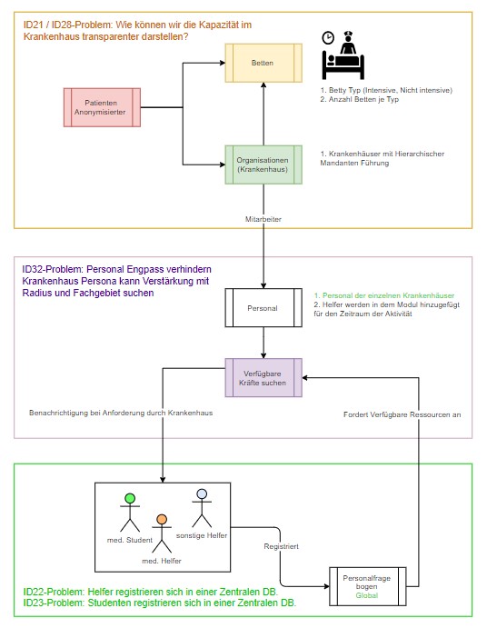 Die derzeitige Ausnahmesituation fordert das gesamte Gesundheitssystem. Der Kampf gegen das Coronavirus hat uns in Europa und der Welt völlig unvorbereitet angetroffen. Es gibt zum Einen immer mehr freiwillige Helfer mit entsprechendem med. Background, die bereit sind sich am Kampf gegen Corona zu beteiligen. Zum Anderen gibt es seitens der Krankenhäuser und Institutionen des Gesundheitssystems eine immense Nachfrage nach helfendem Personal und zudem Intensivbetten mit Beatmungsgeräten. Um eine schnelle Zusammenführung zwischen Krankenhaus und Personal zu gewährleisten und eine transparente und ständig aktualisierte Übersicht über verfügbare Intensivbetten zu bieten, bedarf es einer zentralen und automatisierten Registrierungs- und Verwaltungsstelle.